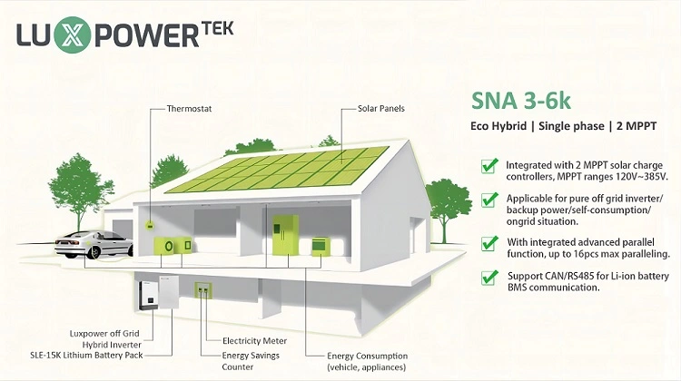 L'inverter Off-Grid SNA6000 LuxPower supporta i sistemi di convertitore DC-DC, fungendo da potenza di backup affidabile o da una sostituzione del generatore diesel. Con funzionalità parallele, la capacità del sistema si ridimensiona da 6KW a 96kW. L'inverter supporta le modalità di lavoro del convertitore DC-DC: